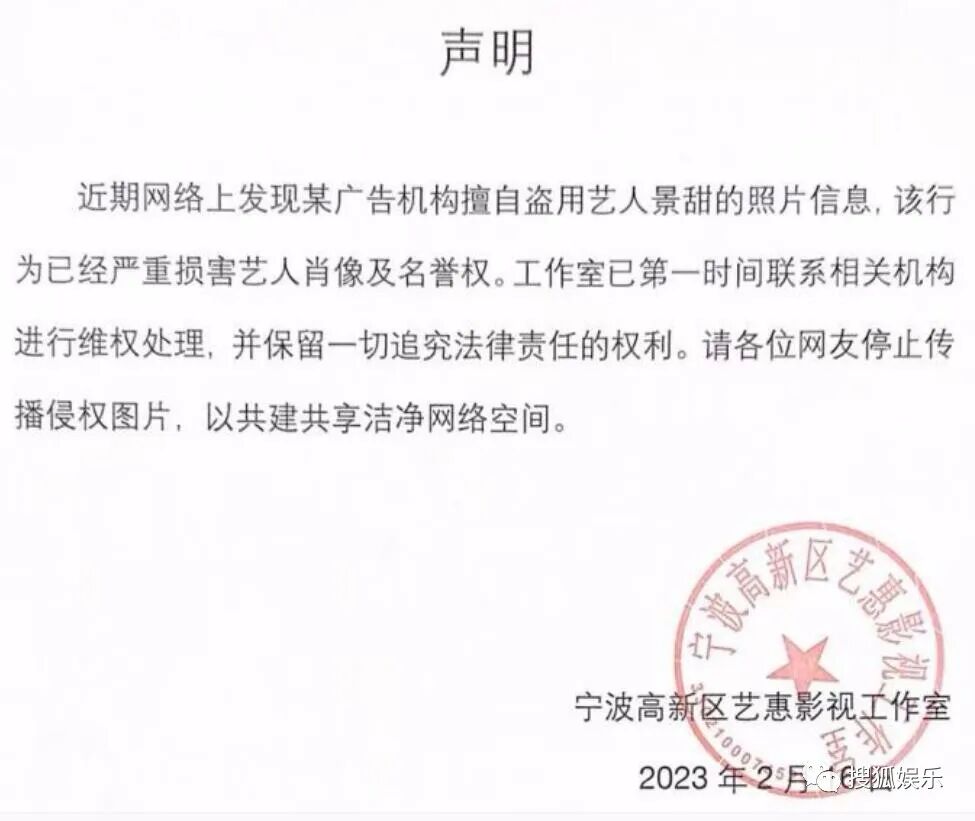 下午,景甜工作室發佈維權聲明:該行為已經嚴重藝人肖像及名譽權,工作室已第一時間聯繫相關機構進行維權處理,並保留一切追究法律責任的權利。