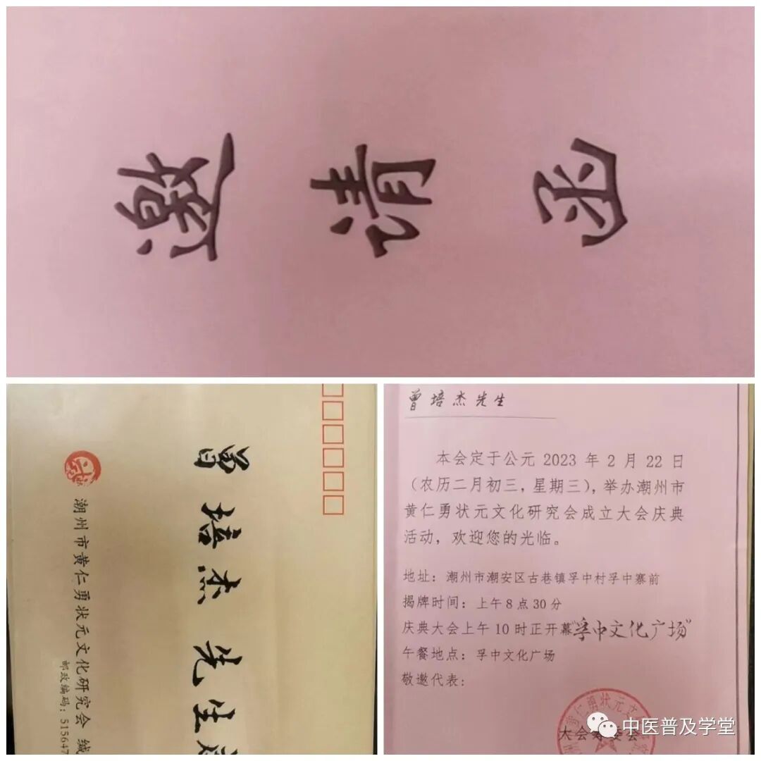 緣起:曾師於2月6日,收到來自潮州市黃仁勇狀元文化研究會成立大典邀請函