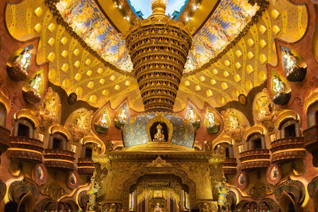 外形金碧輝煌酷似金鐘罩,步入其中,猶如白色的天宮,一朵巨大蓮花盆。
