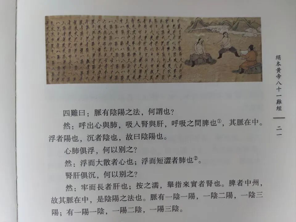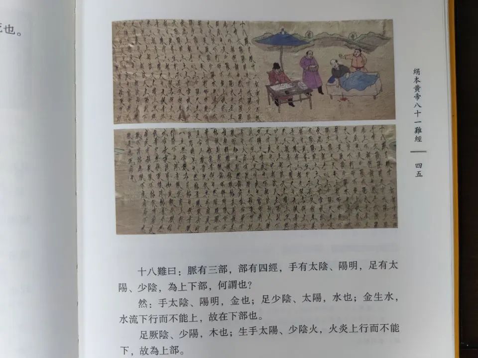 《難經》 傳說為扁鵲所作, 又稱 《黃帝八十一難經》, 其實是西漢人在 《內經》 理論上釋難解疑, 全書內容簡要, 辨析精闢,是古代醫書的名著。 楊莉萍所校注的絹本 《難經》 中的插圖, 為髡髮契丹人, 文字也多處保存宋版內容, 說明是一部宋版或遼版《難經》, 是目前發現的最早 《難經》 版本。 古玩界素有 “一頁宋版書一兩黃金”之說, 可知這是一項重大的學術發現。