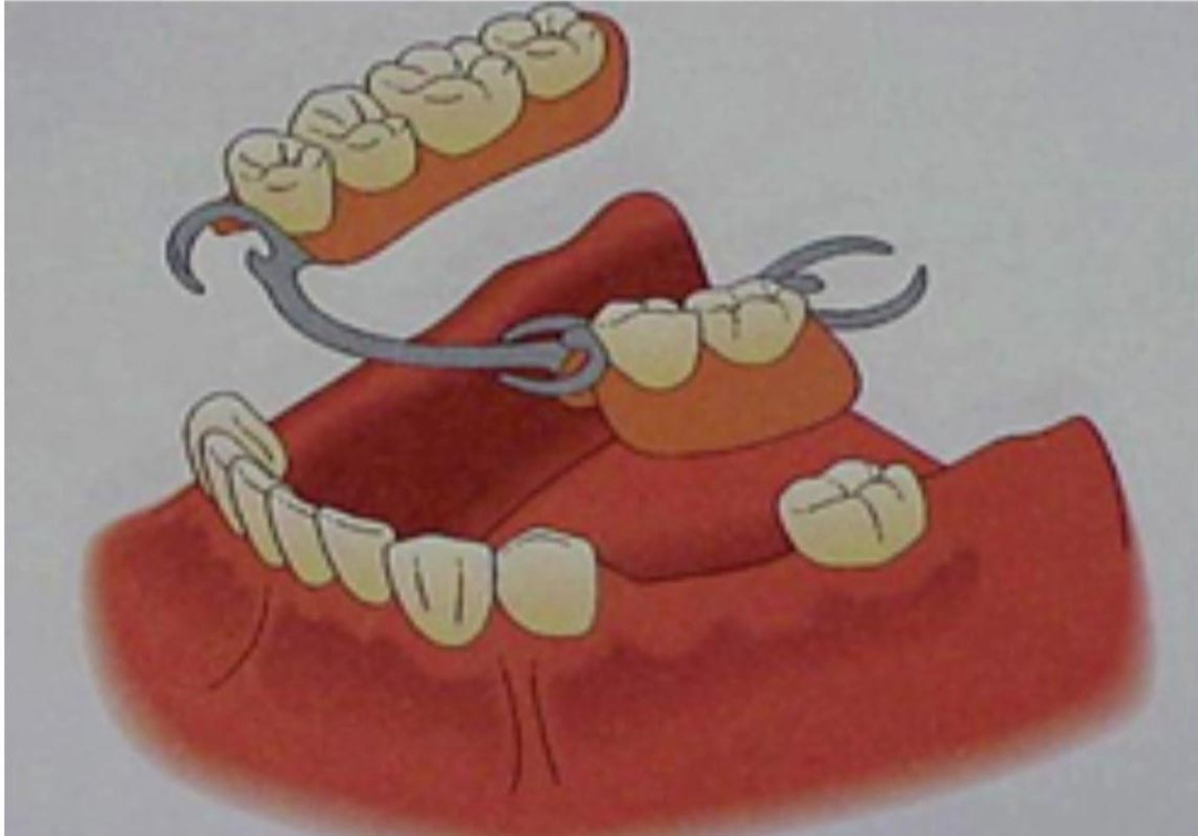 活動義齒修復最早的修復方式,具體方法是在缺牙的部位做一個樹脂牙,並在樹脂牙兩邊鑄造金屬卡環,用於固定在兩邊的基牙上。
