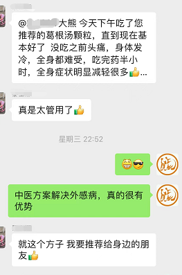 而在同一個群裡,我指導用葛根湯治療甲流的鄰居,就吃了一袋葛根湯,就把甲流扼殺在惡寒發熱的太陽病傷寒階段了。