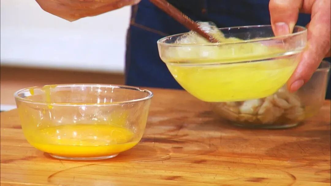 處理好的魚肉下鍋煎至微熟後,盛出備用。雞蛋將蛋清和蛋黃分開,將黃魚肉加入蛋清中攪打均勻。