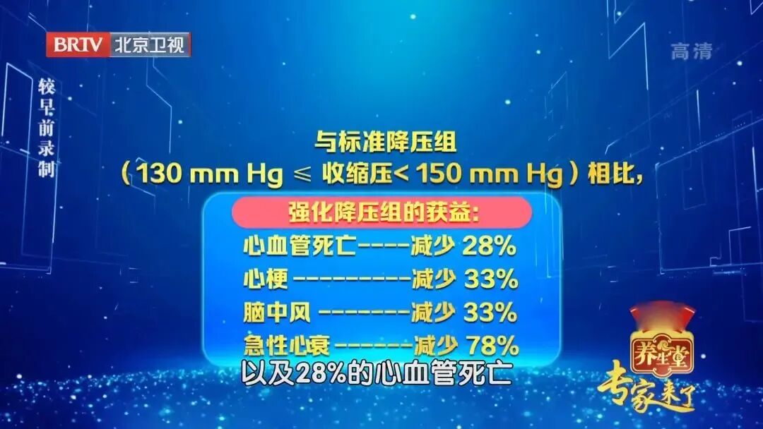 與標準降壓組(130mmHg≤收縮壓<150mmHg)相比,強化降壓組(<130mm Hg):心血管死亡少28%、心梗少33%、腦中風少33%、急性心衰少78%。
