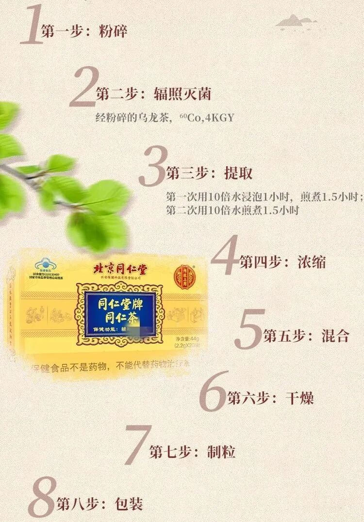 同仁茶的炮製過程經“粉碎、輻照滅菌、提取、濃縮、混合、乾燥、制粒、包裝”八步繁雜工藝。