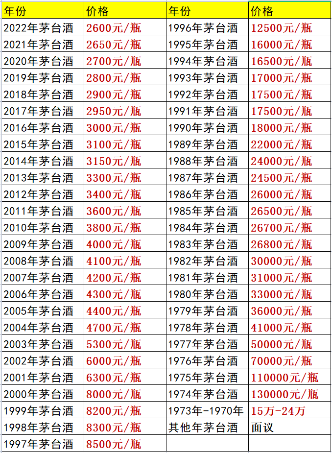1969年-1953年 茅臺25萬-260萬/瓶。