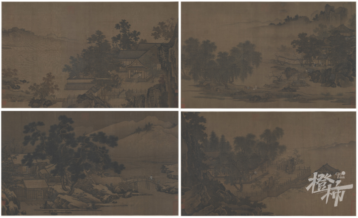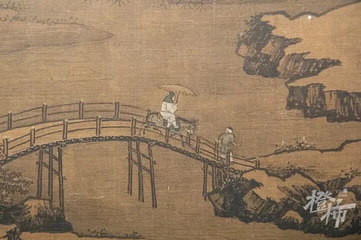 《四景山水圖》中的冬天場景裡,主人興起,騎驢出遊,不知是去訪友還是尋梅,老翁穿得很厚實,可見當時的杭州冬天也是陰冷刺骨的,重點是,橋這頭的屋門口,竟然還畫有一個婦人透過門簾探出半個身子,彷彿在張望橋那頭遠行的親人。