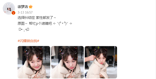 這事兒的起因其實很簡單,就是徐夢潔發了幾張自己的照片,希望粉絲給P個濾鏡,互動一下。