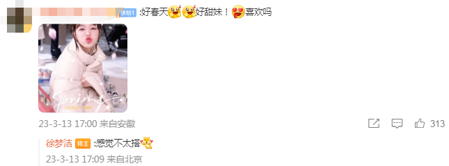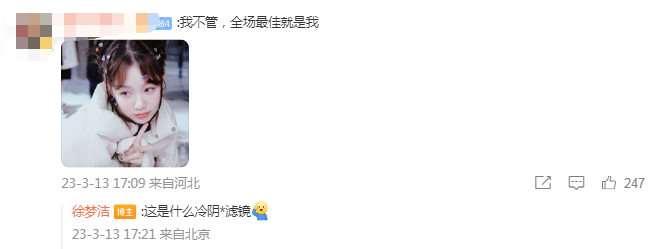 粉絲:“看我的!這個色調帥不帥!” 徐夢潔:“一般般吧~” 粉絲:“好春天,好甜妹!喜歡嗎?” 徐夢潔:“感覺不太搭。” 粉絲:“我不管全場最佳就是我!” 徐夢潔:“這什麼冷陰濾鏡?”