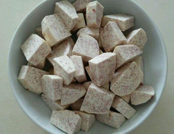 2、蒸香芋:香芋去皮,切塊狀,蒸鍋蒸至香芋約20分鐘至粉糯(筷子能輕鬆穿過),備用;