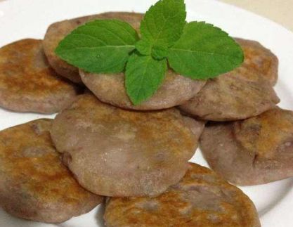 3、將此時的香芋糊分成8-10份,搓圓,拍扁,製成小圓餅狀,外層粘上細麵包糠。