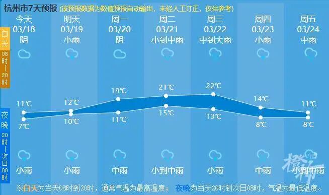 下週初,浙江的降水屬於暖區降水,氣溫也將陸續回升至2字頭,預計麗水下週三的最高氣溫飆升至28℃,杭州20-22日最高氣溫預計18~23℃。