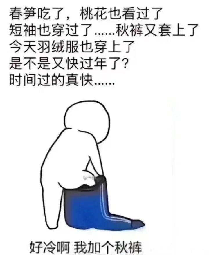 為什麼?因為地暖關了,春筍吃了,桃花也看過了,短袖也穿過了,電風扇拿出來了,現在秋褲又套上了,羽絨服也重新拿出來了,一週過完四季,你說是不是該過年了?