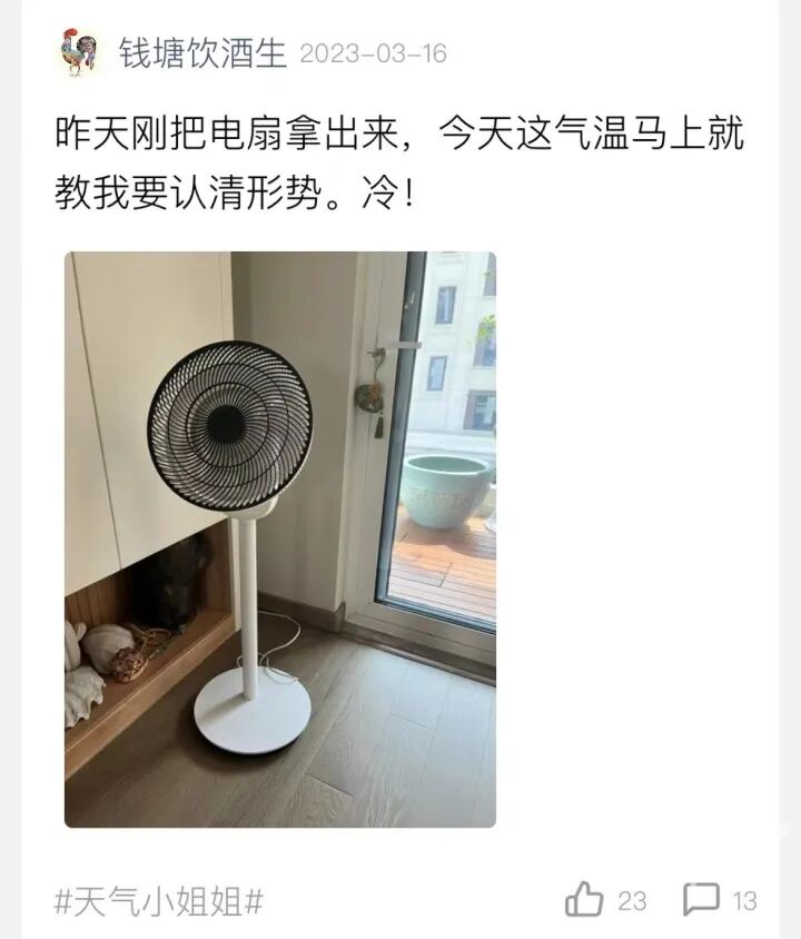 入春後杭州的天氣確實有點離譜,接近30℃的氣溫已經亮相數次,可以說是夏天路過的“證據”了,有人自信關掉了地暖,有人拿出了電扇:
