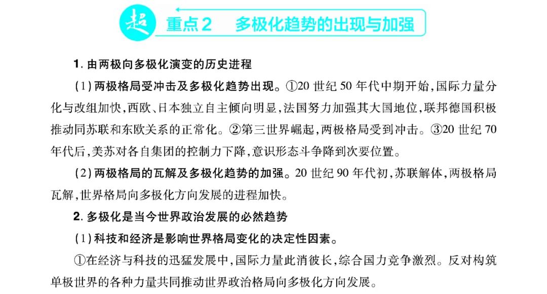 (2)形成:第二次世界大戰後,兩極格局——(美蘇爭霸);單極格局(美國)——東歐劇變、蘇聯解體;世界多級化深入發展【尚未完全形成】。