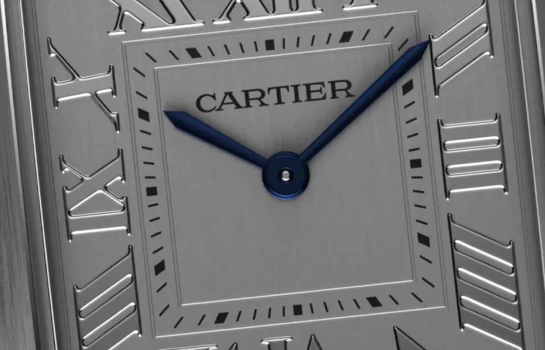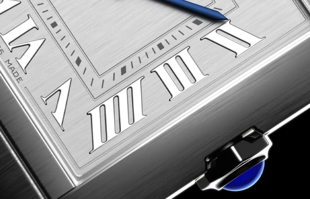 羅馬數字時標與分鐘軌構成Tank的標誌性錶盤,羅馬其中羅馬數字7(VII)的一部分由“CARTIER”代替。此外,Tank的大部分錶款的錶冠上都裝飾了一顆藍色凸圓形寶石。
