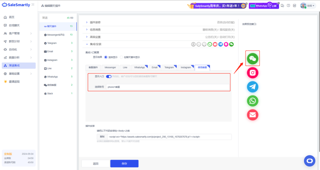 插件集成入口配置支持微信客服