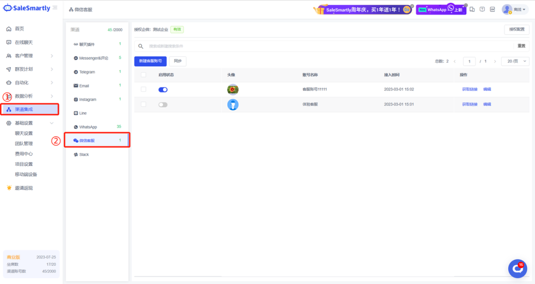 在【渠道集成】處,新增“微信客服”渠道。授權完成後,SaleSmartly將在後臺自動為您創建一個新的客服賬號,您也創建新的客服賬號。創建客服賬號後,您還可以點擊“獲取鏈接”,使用掃碼或鏈接的形式體驗微信客服。
