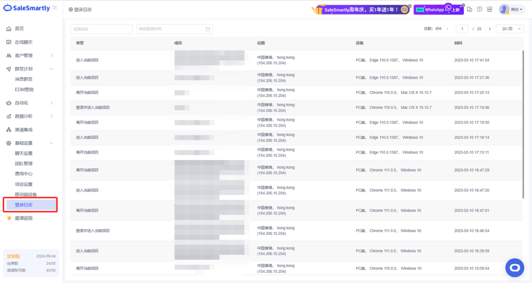 在【基礎設置】中,新增登錄日誌功能,當團隊成員登錄或退出項目時,將在登錄日誌列表中生成記錄。