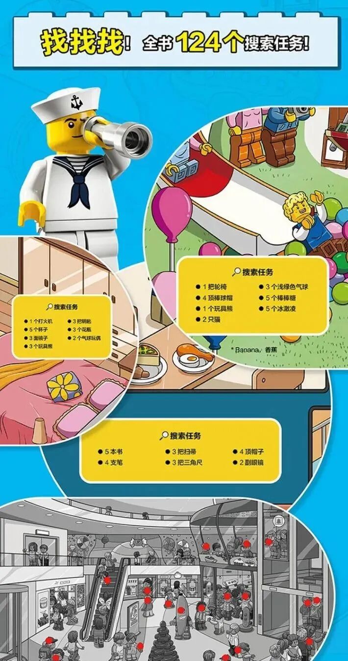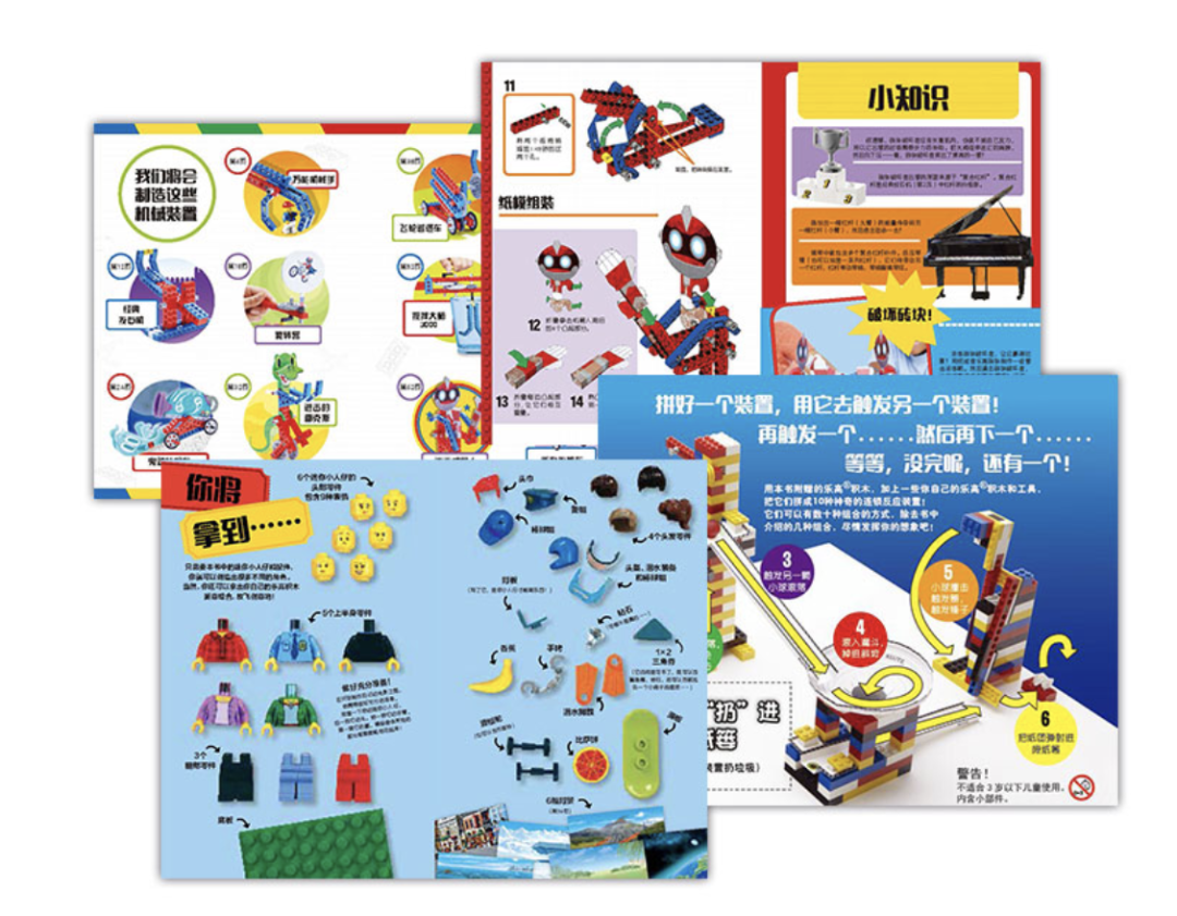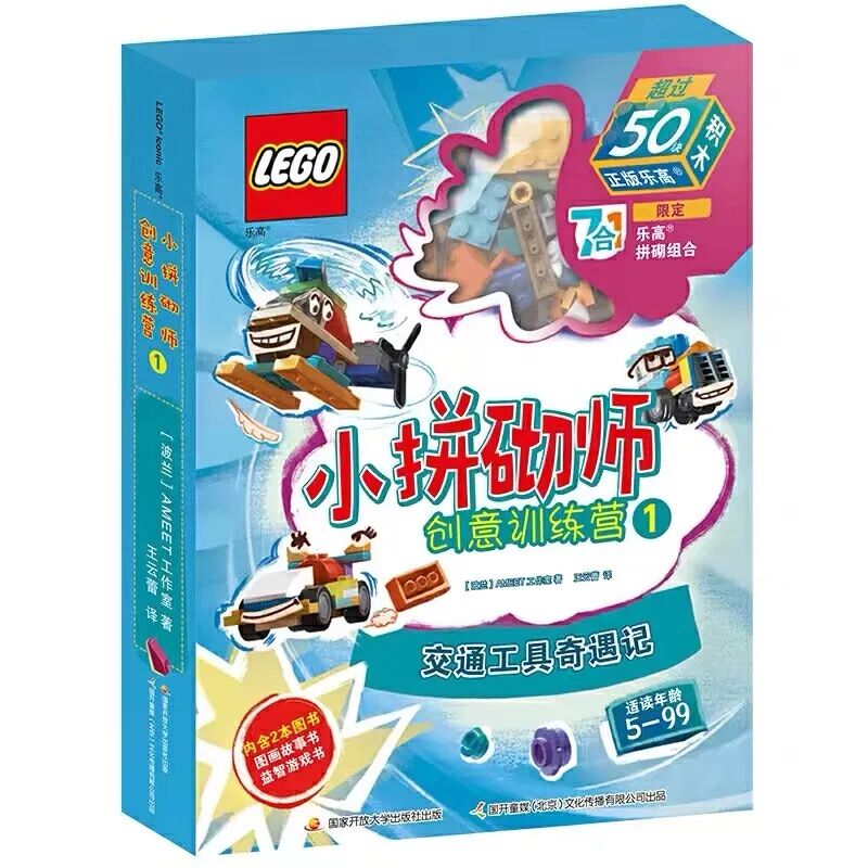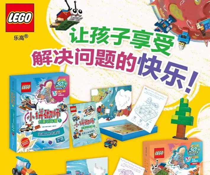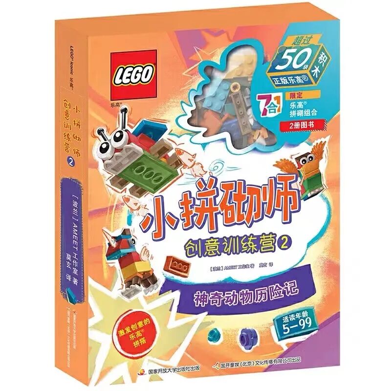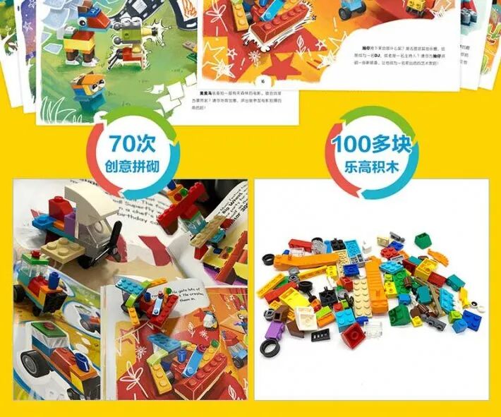 每盒內含一冊拼搭故事書及一冊思維遊戲冊,附樂高限量積木塊玩具。每盒贈送50顆粒以上正版樂高積木,能拼搭7-8種造型。掃描盒子封底小程序碼,還可免費獲取生動直接的拼砌指導視頻。