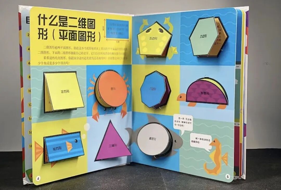 書中涉及度量、角度、幾何元素、圖形特性、形狀變換、立體圖、展開圖等方面的知識點,讓孩子在絢麗的色彩和趣味的翻翻頁中玩轉幾何思維。