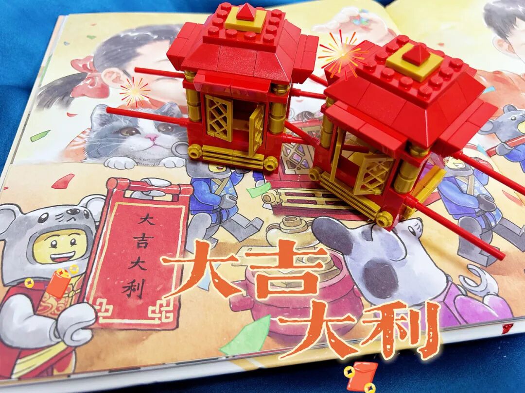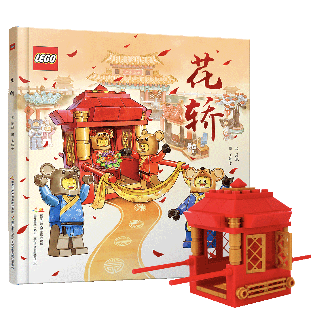 畫風上選擇了粗線條勾邊、水彩上色暈染的方式,頗具中國風的特點。隨書附贈的樂高積木拼搭的花轎套裝,108顆粒,金紅相間,精緻還原了傳統花轎的樣子,又在畫面中賦予了它更多的如可以搬運糖果等的功能,讓小朋友們拼搭閱讀之餘,還能有更多想象空間。