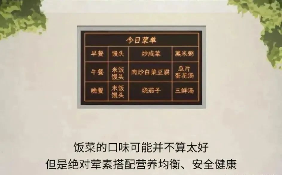 不用擔心,雖然飯菜的口味不一定很好,吃不上喝啤酒吃燒烤,但是和外界的一些垃圾食品相比,絕對要更健康,因為葷素搭配、營養均衡。