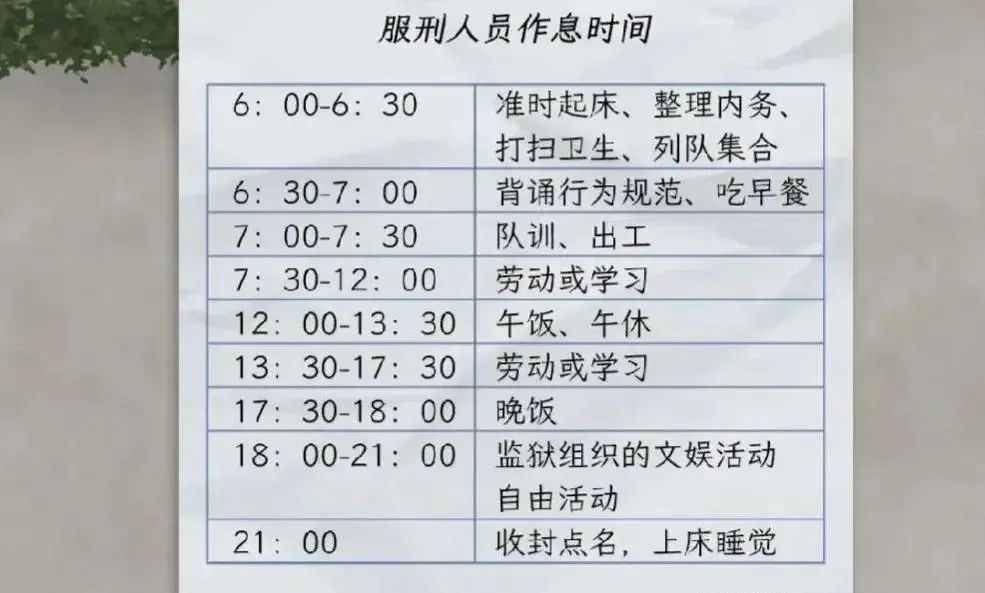 監獄裡面有詳細的作息表,每一名服刑人員都需要嚴格遵守,比如說起床、整理內務、隊訓、出工、勞動學習、午飯午休、晚飯、點名、就寢等,都有嚴格的時間限制。