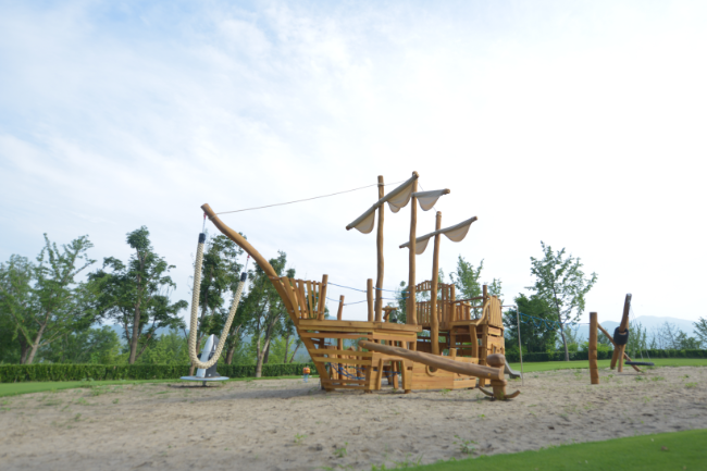 位於島中央區域的德國進口童真樂趣室外兒童樂園,以“發現新大陸”為主題。氣勢磅礴的“哥倫布”號航海船整裝待發,揚帆起航!水手們準備就位,魚兒在歡跳;時不時遇到狂風大浪,在水面上上下顛簸、來回晃動,充滿千難萬阻;穿過樹林、跨過峭壁,終於登上城堡之巔,滿心自豪….