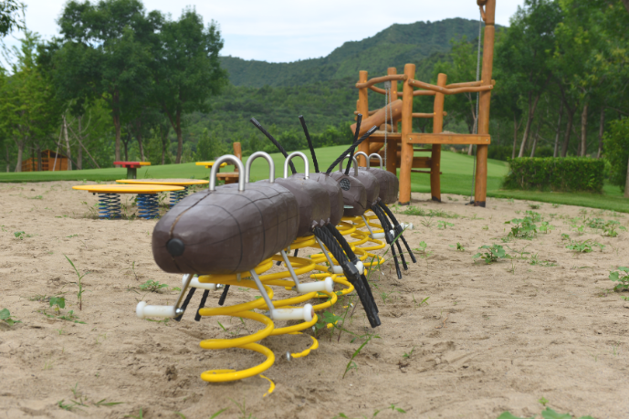 螞蟻蹺蹺板,一共設置了6個座位,人體工程學設計的踏板和抓手把孩子鎖定在螞蟻的身上,讓孩子們充分利用自己的力量,以及相互的配合,使蹺蹺板上下晃動。