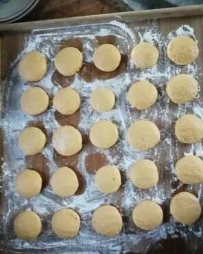 然後接下來我們再把攪拌好的麵糰用手給它揉成條狀,接著再取下一小團做成餅,在做餅之前先在置板上面撒一些粉在上面,預防小餅粘板。