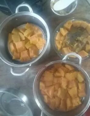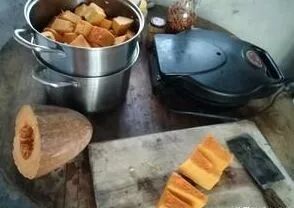 首先我們需要把準備好的那五斤南瓜洗乾淨,然後把它們全部都切成大塊,接著在全都放到蒸鍋裡面,大火蒸熟。