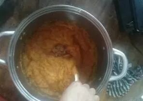 蒸熟以後,我們再把它全部都用勺子攪拌,最後攪的和粥狀一樣就可以了。