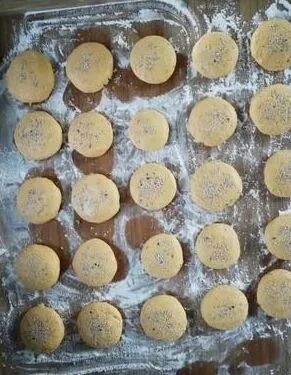 待到所有小餅做好以後,在輕輕地在上面拍上一些生芝麻就可以了。