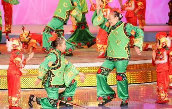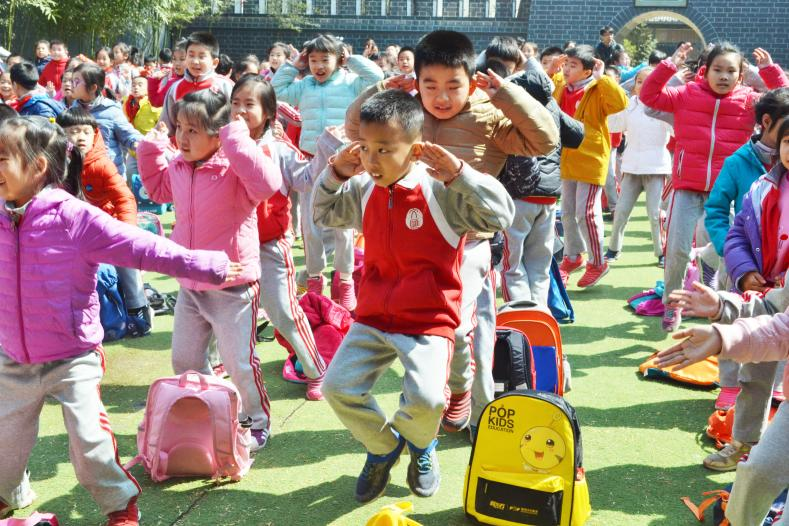 小朋友和家長一起學跳《俏夕陽》皮影舞,就是2006年春晚那群老太太跳的皮影舞蹈……剪刀跳、青蛙跳……都是經典的皮影動作,讓大家在民間藝術裡尋找動感的韻律。