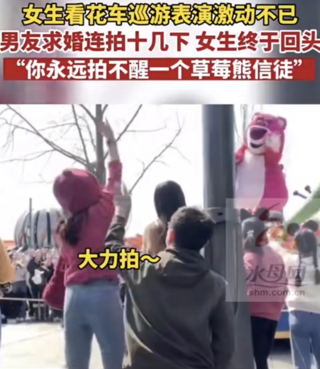 3月16日(發佈時間),上海迪士尼。一女生看花車巡遊表演激動不已,男友求婚連拍十幾下,女生終於回頭。網友:看的太入迷了吧!男友真會挑時間。