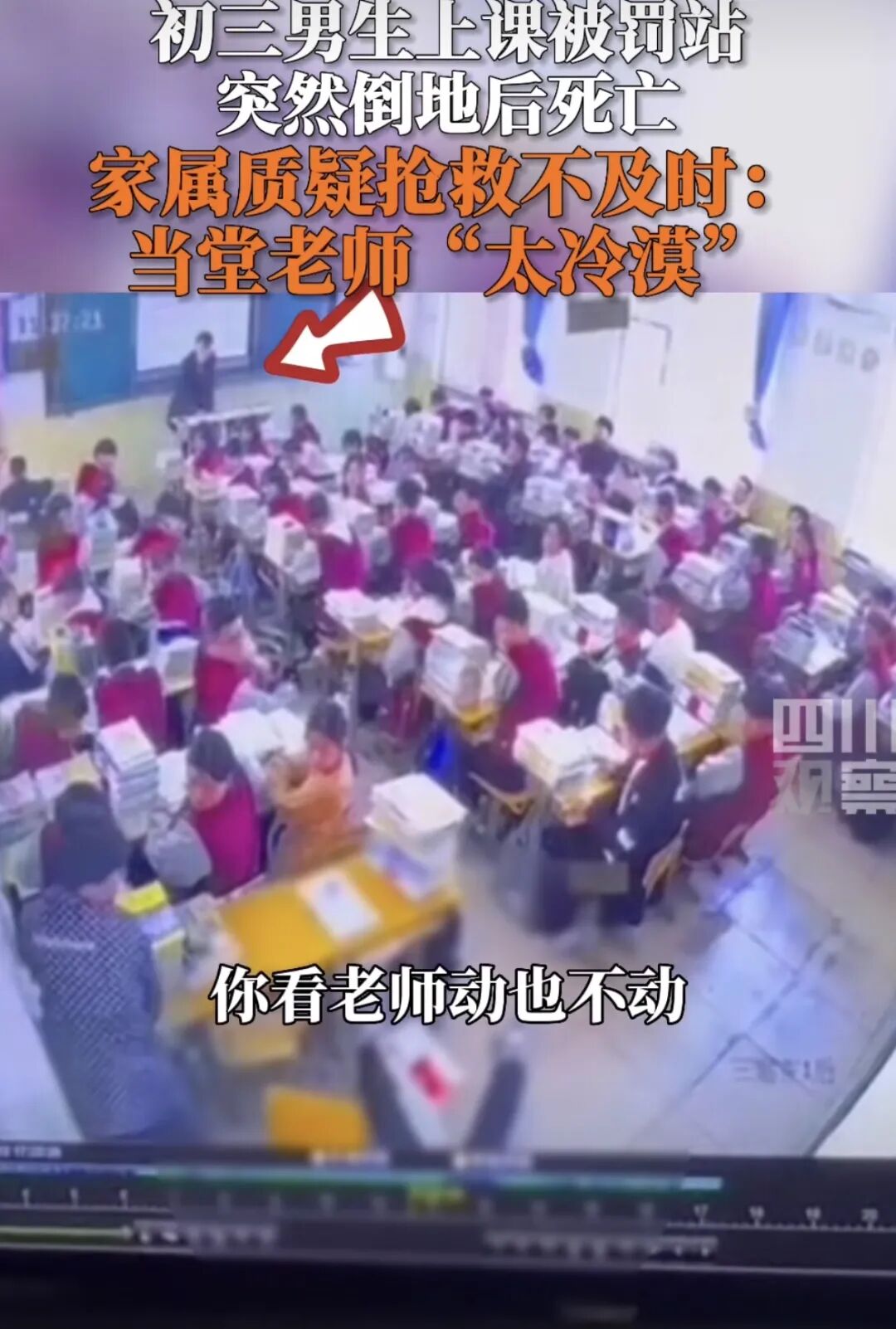 河北邯鄲。初三學生被罰站突然倒地後去世。據監控視頻顯示,班裡同學發現其倒地後起身查看,科任老師過了一會兒前往查看後,讓學生去叫班主任。#學生去世家長質疑搶救不及時#對此情況,孩子父親質疑科任老師搶救不及時,“太冷漠”。