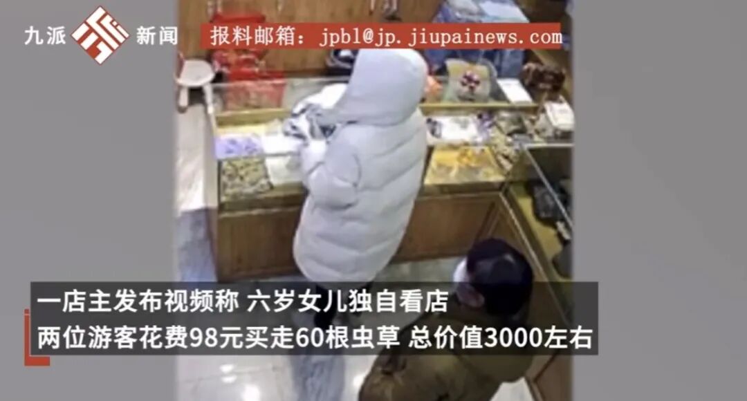 四川康定。一特產店主發佈視頻稱,6歲女兒獨自看店,兩位遊客花費98元買走蟲草。店主王女士稱,這些蟲草的實際價格為3000元,希望兩位顧客能夠將蟲草退回,自己將錢款退還給他們。