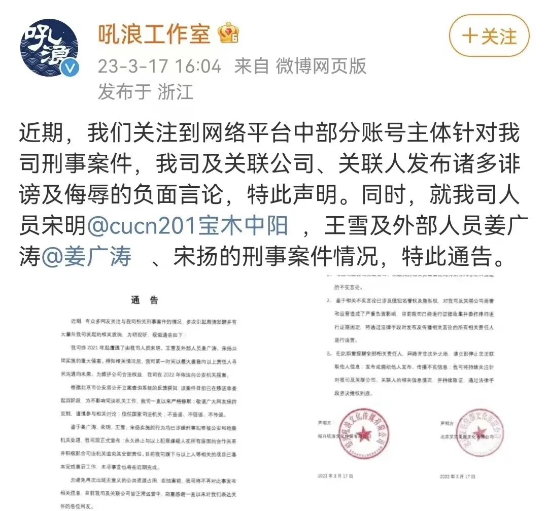 吼浪工作室發佈關於公司人員宋明,王雪及外部人員姜廣濤姜廣濤 、宋揚的刑事案件情況的通報,稱以上四人的行為均已涉嫌刑事犯罪被公安和檢察機關處理,公司已永久終止與以上犯罪嫌疑人的合作關係。