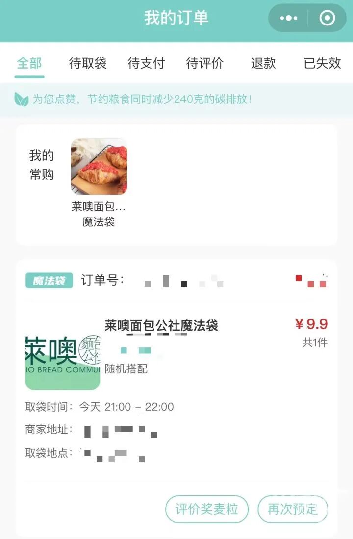 “惜食魔法袋”上入駐的烘焙門店,主要有萊噢麵包公社、九月生活、玲瓏甜丫丫、達克布蕾、墨茉點心局等。每天凌晨00:10,商家會開售魔法袋,數量不定,消費者先到先得。
