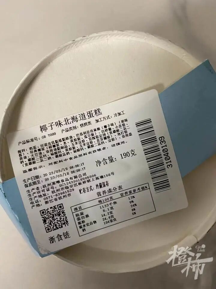 拆開包裝袋,能看到椰子味北海道蛋糕的外包裝上,貼著明確的生產日期、保質期以及食品配料等信息標籤。如店員所說,這款蛋糕保質期有3天,在3月18日早上8點多就過期。但另一個奶酪麵包上,則沒有生產日期、保質期、配料表等的標籤。