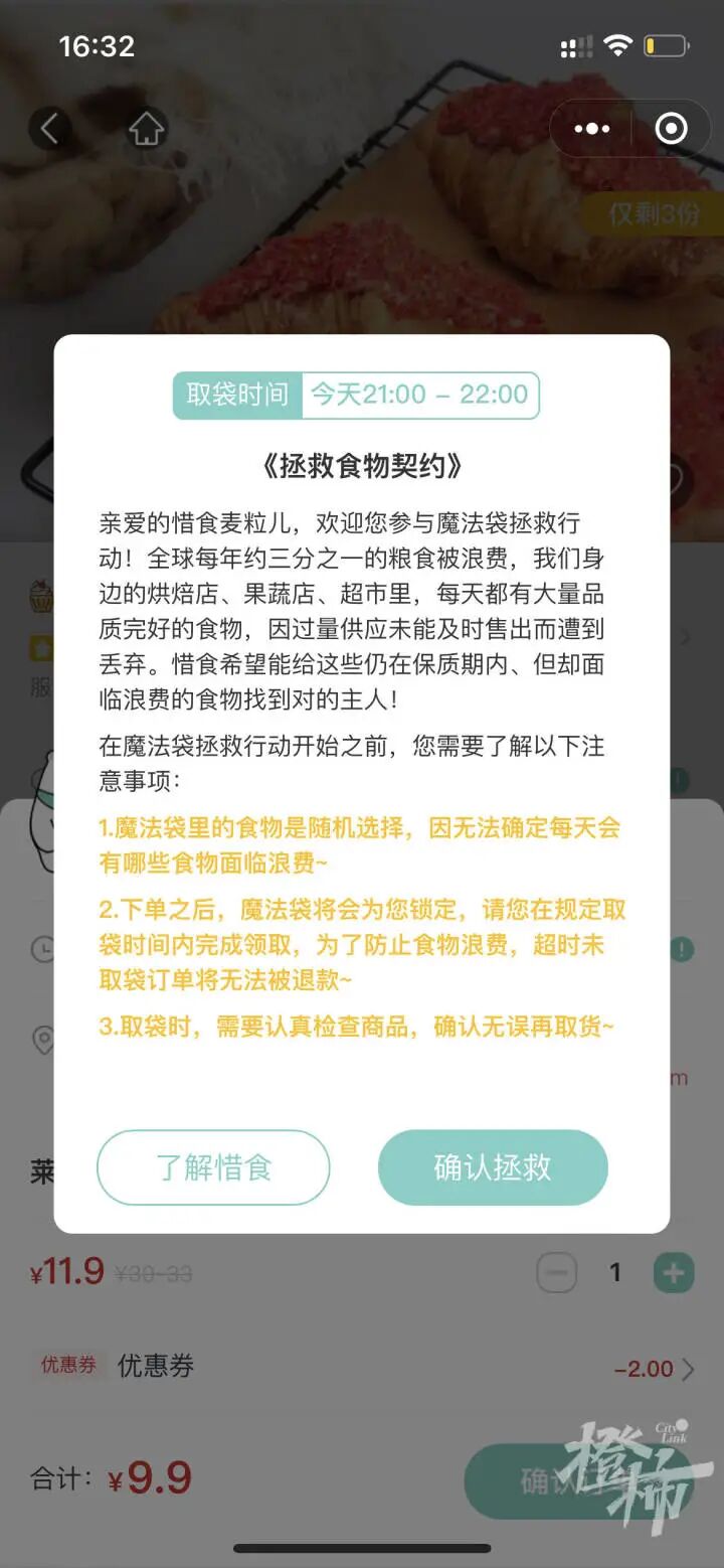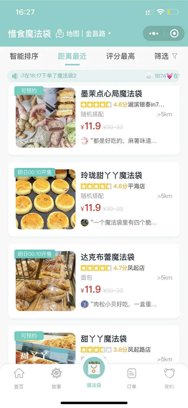 不過,搜索發現,目前在杭州上線的食品盲盒平臺,暫時還只有“惜食魔法袋”一家,且入駐的商家均為連鎖烘焙品牌店。也就是說,杭州消費者如果想買這種“剩菜盲盒”,能買到的只有麵包、蛋糕這一種類型商品。