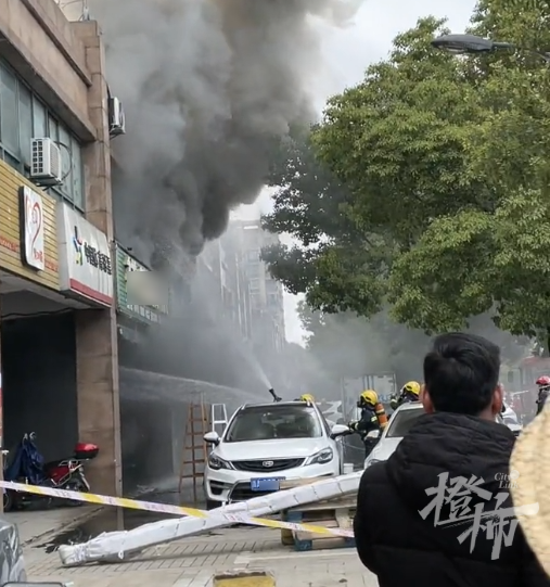 現場視頻顯示:著火點位於一排臨街商鋪的二樓,現場濃煙滾滾,消防人員正在緊張撲救,周圍拉起警戒線。