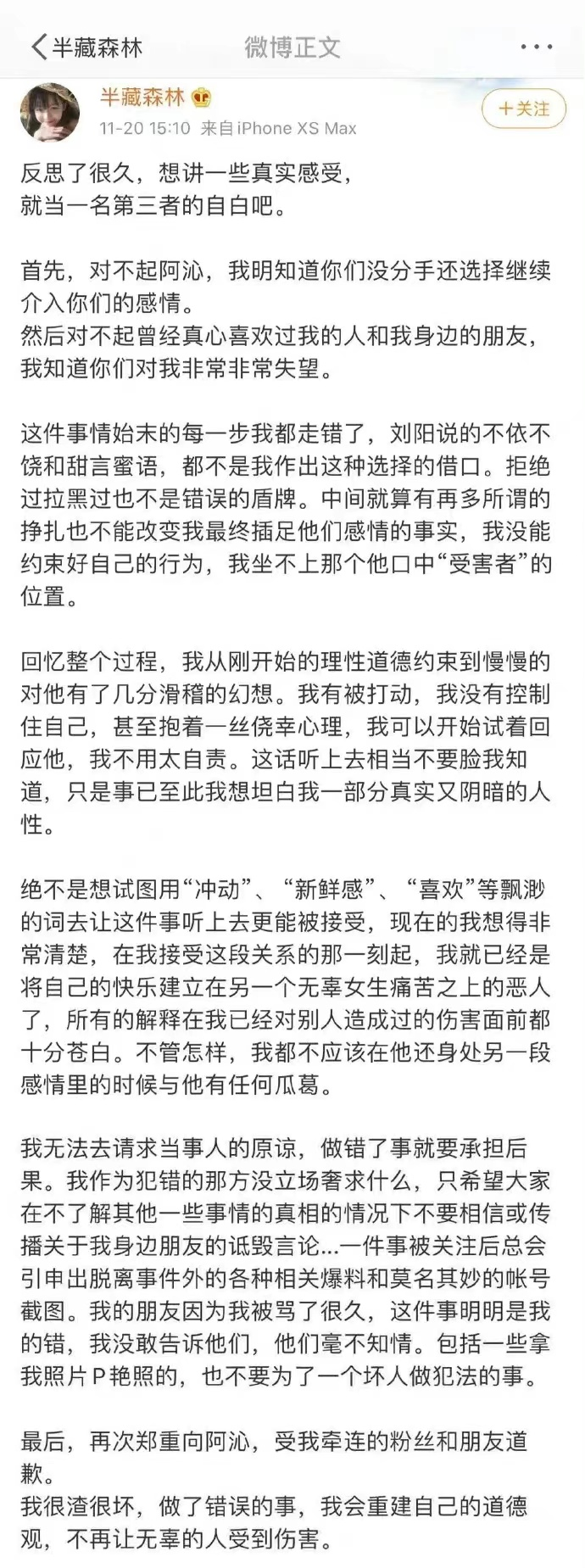 而作為插足別人感情的第三者半藏森林,隨後也發佈了一篇長文講述了自己“知三當三”的心路歷程。