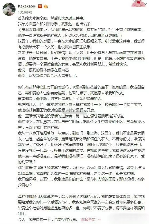 事發後,阿沁雖痛不欲生,但也不曾優柔寡斷,她將聊天截圖與兩人的出軌證據公開發布,宣佈與劉陽徹底分手。
