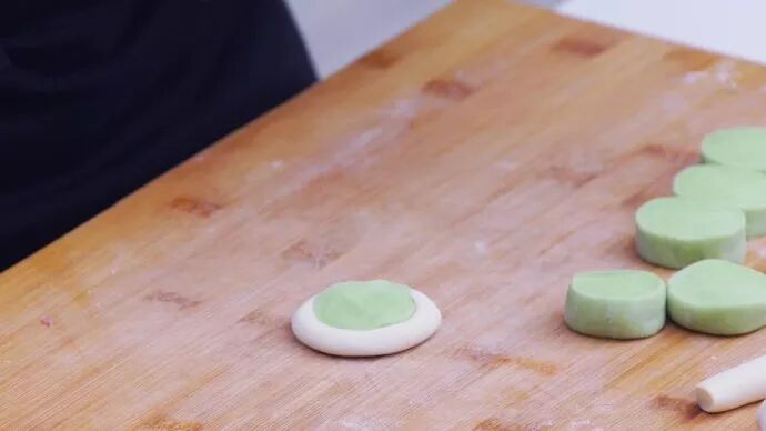 3、薺菜麵糰切段,按壓成麵餅狀。外面圍上牛奶麵糰,擀成薄皮,包入餡料做成雲吞。