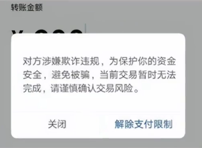 第二種情況,對方涉嫌欺詐違規,為保護您的資金安全,避免被騙,當前交易暫時無法完成,請謹慎確認交易風險,這就說明對方的這個微信賬戶已經涉嫌欺詐違規,有可能是騙子已經被微信支付檢測到了,這個時候我們可以直接點擊關閉按鈕,也可以確認對方身份,之後再點擊解除支付限制,最後再進行支付。