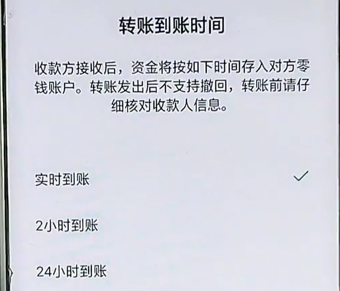 我們可以更改一下,兩個小時或者是24小時到賬,然後點擊完成,設置完成之後,對方在兩個小時之後或者是24小時之後才能收到我們這筆錢。