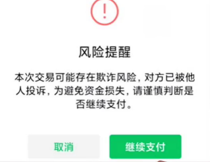 第一種情況出現,風險提醒的字樣本次交易可能存在欺詐風險,對方已被他人投訴為避免資金損失,請謹慎判斷是否繼續支付。如果出現了風險提醒的字樣,就說明對方的賬戶已經被其他的微信用戶進行投訴了,而且這種投訴是成立的,所以說微信官方才會給我們這種提醒,大家千萬不要著急忙慌的去點擊繼續支付,一定要謹慎判斷,防止自己被騙。
