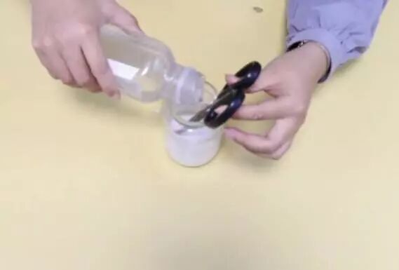 然後再倒上一些白醋,小蘇打和白醋會迅速的發生反應,可以有效的去除剪刀上的鐵鏽;